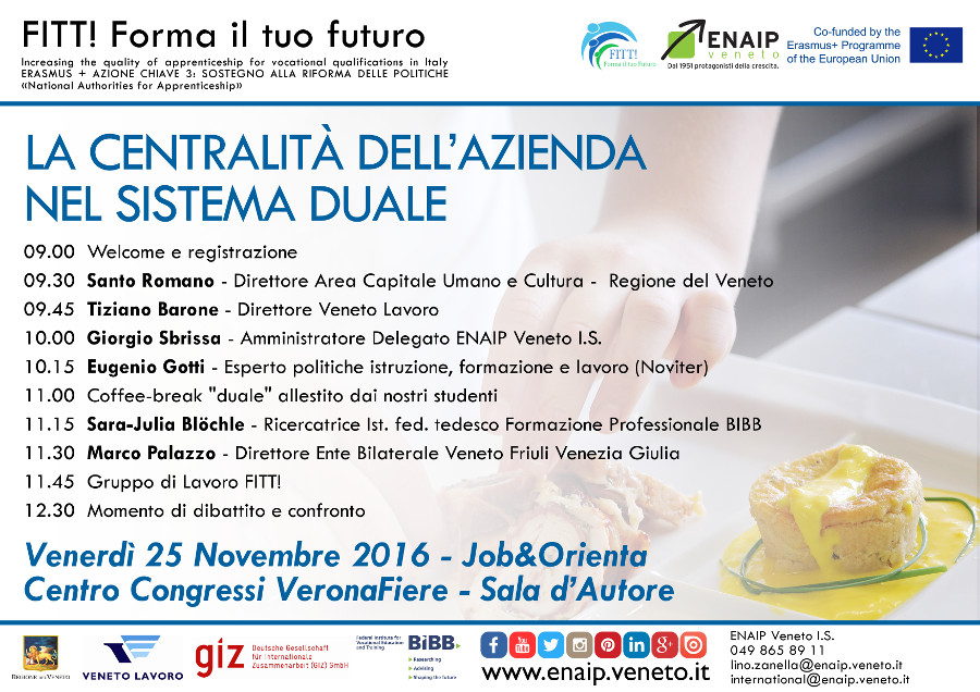 Venerdi 25 Novembre 2016 al Job&Orienta presso il Centro Congressi VeronaFiere (Sala d'autore) il direttore dell'Ente Bilaterale Veneto FVG Marco Palazzo parteciperà al workshop "La centralità dell'azienda nel sistema duale" organizzato dal capofila del progetto FITT! e con la partecipazione del dirigente della Regione Veneto Santo Romano e gli interventi del direttore di Veneto Lavoro Tizano Barone e l'A.D. Enaip Veneto Giorgio Sbrissa. Per l'occasione interverrano Eugenio Gotti, Esperto politiche suola-lavoro, e Sara-Julia Blochle, Ricercatrice BIBB-Ministero Tedesco.