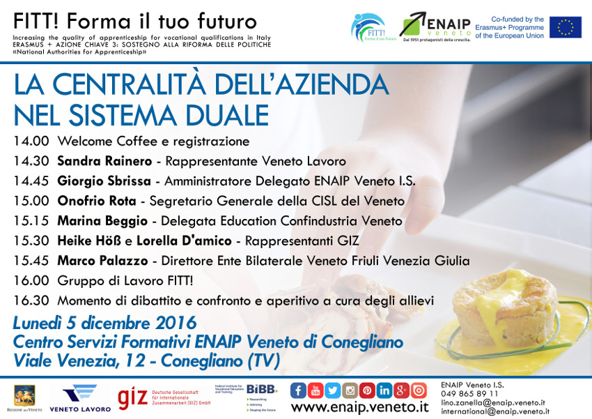 L'Ente Bilaterale Veneto FVG ha il piacere di invitare aziende e consulenti del lavoro al convegno "LA CENTRALITA' DELL'AZIENDA NEL SISTEMA DUALE" che si terrà lunedì 5 dicembre 2016 dalle ore 14:00 alle ore 16:30 a Conegliano presso la sede di ENAIP VENETO in Viale Venezia, 12 (come da programma allegato).